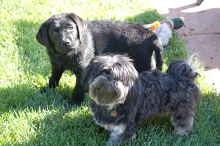Harper with the stick (left to right: Boo, Harper, Sumpin, Poldark) and Blue, Egan Clue, Harper, and Jersey in the kitchen!